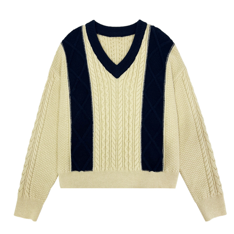 定制秋季v领休闲套头衫落肩毛衣时尚长袖电缆针织女式毛衣